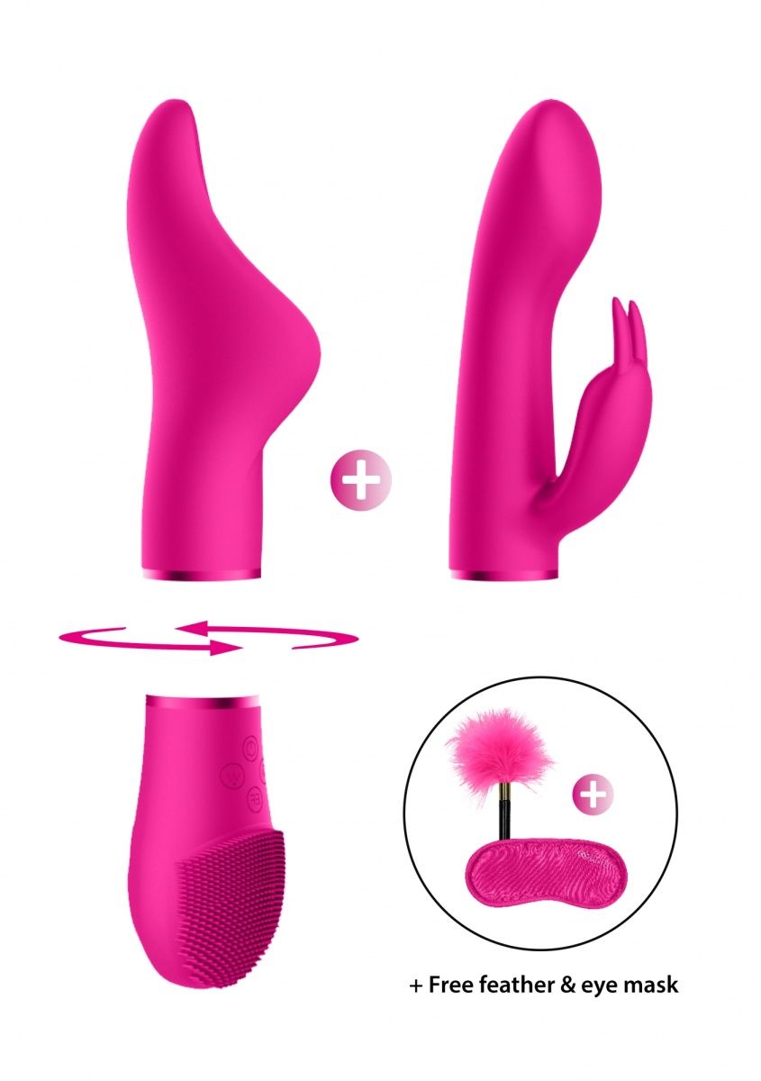 Набор Pleasure Kit №1 - набор состоящий из универсальной базы, двух взаимозаменяемых насадок, маски для глаз и пуховки. Насадки и база изготовлены из гипоаллергенного, мягкого на ощупь медицинского силикона и превосходного АБС-пластика. Игрушка имеет двойной мощный мотор в основании, мотор в насадке для клиторальной стимуляции и два мотора в насадке кролике, которые обеспечивают 10 скоростей вибрации, способной достигать 15000 оборотов в минуту. Набор включает маску закрытого типаи перьевую пуховку для эротических ролевых игр. Основание имеет особые щетинки с одной стороны и ребристую поверхность с другой для внешней стимуляции, в том числе клиторальной. В комплект входят две взамиозаменяемые насадки. Одна из них имеет особую форму с заостренной головкой и двумя боковыми крыльями, обеспечивающими для дополнительного воздействия. Она стимулирует не только клитор, но и половые губы и делает удовольствие более ярким. Вторая выполнена в виде вибратора-кролика. Она имеет слегка скошенную головку для более целенаправленной стимуляции точки G. Вибромассажер заряжается через USB и может быть подключен практически в любом месте, просто подсоедините идущий в комплекте шнур к совместимому порту компьютера или USB-адаптера (приобретается отдельно), а противоположный конец к разъему у основания. Полная зарядка занимает 120 минут, ее достаточно для беспрерывной работы до 75 минут. В комплекте: 2 насадки, база, маска для глаз, пуховка. Длина базы - 8 см., диаметр - 4,5 см. Длина клиторальной насадки - 12,5 см., диаметр - 3,2 см. Длина насадки-кролика - 13,5 см., диаметр - 3,3 см.