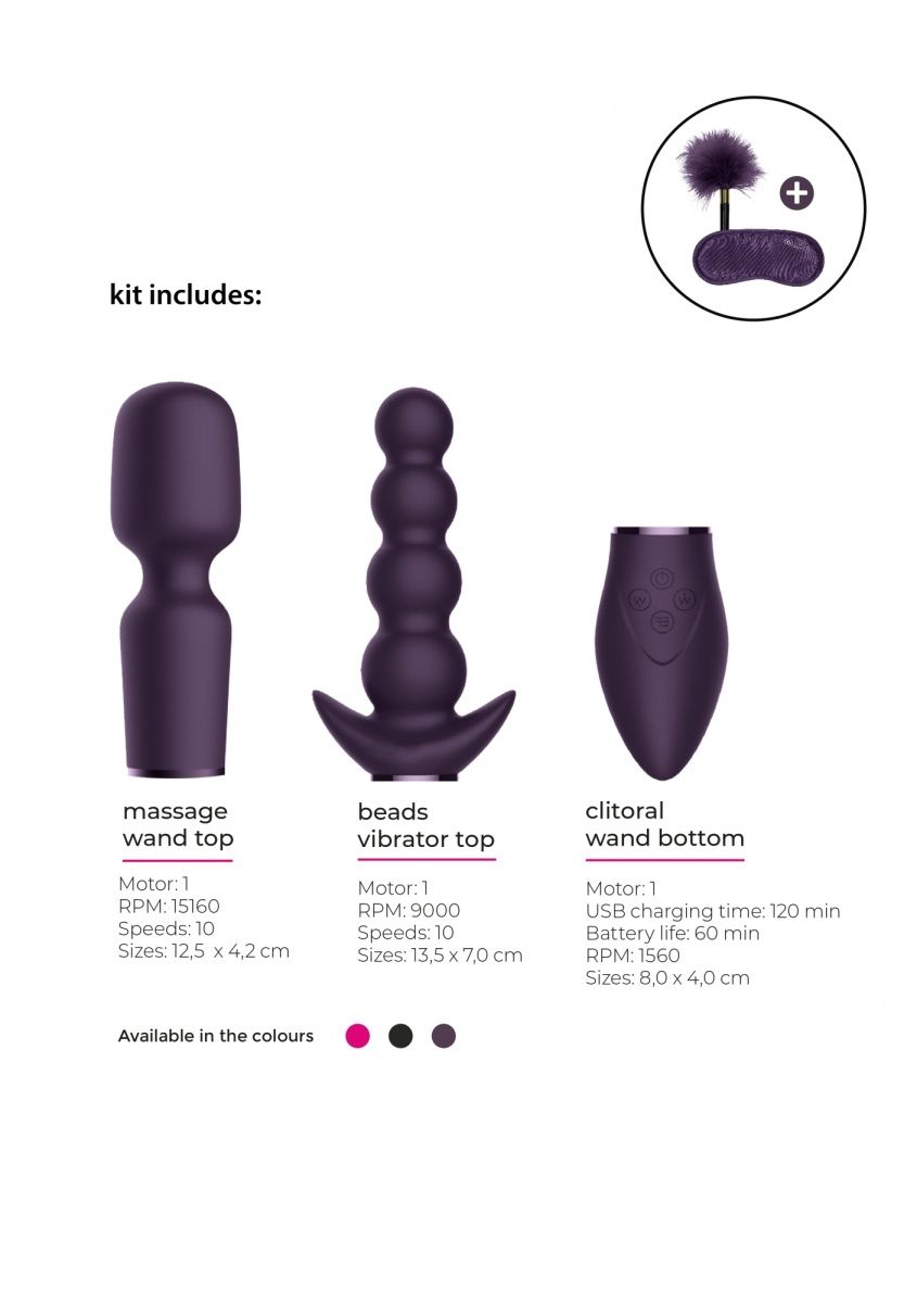 Набор Pleasure Kit №3 - набор состоящий из универсальной базы, двух взаимозаменяемых насадок, маски для глаз и пуховки. Игрушка имеет двойной мощный мотор в основании, мотор в универсальной насадке и мотор в насадке с бусинками, которые обеспечивают 10 скоростей вибрации, способной достигать 15000 оборотов в минуту. Набор включает маску закрытого типа и перьевую пуховку для эротических ролевых игр. Основание имеет особые щетинки с одной стороны и ребристую поверхность с другой для внешней стимуляции, в том числе клиторальной. В комплект входят две взаимозаменяемые насадки. Одна из них имеет универсальную форму и подходит для внешней стимуляции. Вторая выполнена в виде четырех постепенно увеличивающихся шариков. Она идеально подходит как и для вагинальной так и анальной стимуляции. Вибромассажер заряжается через USB и может быть подключен практически в любом месте, просто подсоедините идущий в комплекте шнур к совместимому порту компьютера или USB-адаптера (приобретается отдельно), а противоположный конец к разъему у основания. Полная зарядка занимает 120 минут, ее достаточно для беспрерывной работы до 75 минут. В комплекте: 2 насадки, база, маска для глаз, пуховка. Длина базы - 8 см., диаметр - 4,1 см. Длина универсальной насадки - 12,5 см., диаметр - 3,2 см. Длина насадки с бусинами - 13,5 см., диаметр - 3,6 см.