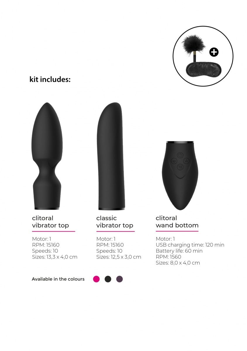 Набор Pleasure Kit №4 - набор состоящий из универсальной базы, двух взаимозаменяемых насадок, маски для глаз и пуховки. Игрушка имеет двойной мощный мотор в основании, мотор в насадке для клиторальной стимуляции и два мотора в насадке кролике, которые обеспечивают 10 скоростей вибрации, способной достигать 15000 оборотов в минуту. Набор включает маску закрытого типа и перьевую пуховку для эротических ролевых игр. Основание имеет особые щетинки с одной стороны и ребристую поверхность с другой для внешней стимуляции, в том числе клиторальной. В комплект входят две взаимозаменяемые насадки. Одна из них имеет заостренную головку для более целенаправленного воздействия и подходит для внешней стимуляции. Вторая выполнена в виде классического вибратора. Она идеально подходит как и для вагинальной так и анальной стимуляции. Вибромассажер заряжается через USB и может быть подключен практически в любом месте, просто подсоедините идущий в комплекте шнур к совместимому порту компьютера или USB-адаптера (приобретается отдельно), а противоположный конец к разъему у основания. Полная зарядка занимает 120 минут, ее достаточно для беспрерывной работы до 75 минут. В комплекте: 2 насадки, база, маска для глаз, пуховка. Длина базы - 8 см., диаметр - 4,1 см. Длина насадки для внешней стимуляции - 13,3 см., диаметр - 4 см. Длина насадки-кролика - 12,5 см., диаметр - 3,1 см.