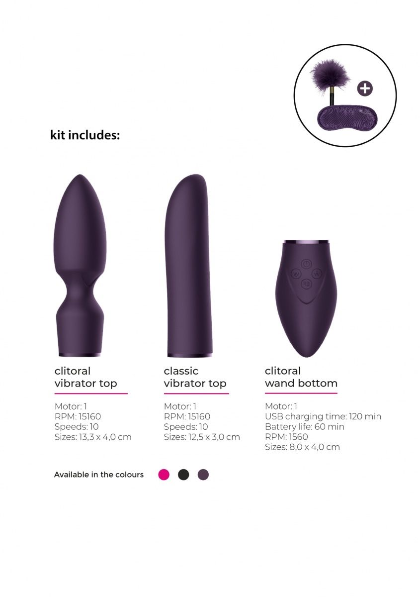 Набор Pleasure Kit №4 - набор состоящий из универсальной базы, двух взаимозаменяемых насадок, маски для глаз и пуховки. Игрушка имеет двойной мощный мотор в основании, мотор в насадке для клиторальной стимуляции и два мотора в насадке кролике, которые обеспечивают 10 скоростей вибрации, способной достигать 15000 оборотов в минуту. Набор включает маску закрытого типа и перьевую пуховку для эротических ролевых игр. Основание имеет особые щетинки с одной стороны и ребристую поверхность с другой для внешней стимуляции, в том числе клиторальной. В комплект входят две взаимозаменяемые насадки. Одна из них имеет заостренную головку для более целенаправленного воздействия и подходит для внешней стимуляции. Вторая выполнена в виде классического вибратора. Она идеально подходит как и для вагинальной так и анальной стимуляции. Вибромассажер заряжается через USB и может быть подключен практически в любом месте, просто подсоедините идущий в комплекте шнур к совместимому порту компьютера или USB-адаптера (приобретается отдельно), а противоположный конец к разъему у основания. Полная зарядка занимает 120 минут, ее достаточно для беспрерывной работы до 75 минут. В комплекте: 2 насадки, база, маска для глаз, пуховка. Длина базы - 8 см., диаметр - 4,1 см. Длина насадки для внешней стимуляции - 13,3 см., диаметр - 4 см. Длина насадки-кролика - 12,5 см., диаметр - 3,1 см.