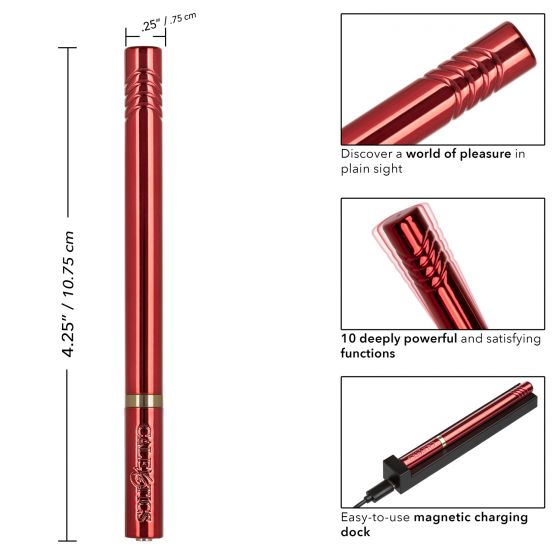 Hidden Pleasures – бесшумный ультратонкий вибратор, сочетающий в себе изысканный внешний вид и мощную стимуляцию. Он изготовлен из безопасных, не содержащих фталатов, хорошо проводящих вибрацию материалов. Сильный мотор обеспечивает 10 режимов вибрации. Благодаря необычной стилизации и компактному размеру игрушка станет идеальным спутником в любой поездке и не вызовет лишних вопросов. Вибромассажер универсален и подходит как для внешней точечной стимуляции, так и для внутренней. Управление осуществляется с помощью одной встроенной в основание кнопки. Чтобы включить или выключить игрушку, необходимо нажать и в течение трех секунд удерживать кнопку питания. Вибромассажер заряжается через USB и может быть подключен практически в любом месте. С помощью удобного и стильного зарядного устройства в виде бокса, полная зарядка занимает всего час времени. Время зарядки - 1 час. Время работы - 1,5 часа.
