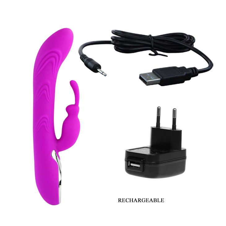 Многоскоростной перезаряжаемый вибратор лилового цвета. Имеет клиторальный стимулятор в виде зайчика. Рельефная поверхность. Имеет 10 режимов вибрации, управление производится при помощи сенсорных кнопок у основания игрушки. Интенсивность вибрации регулируется кнопками + и -. Рабочая длина - 15 см. В комплекте зарядное устройство, инструкция на русском языке, мешочек для хранения.