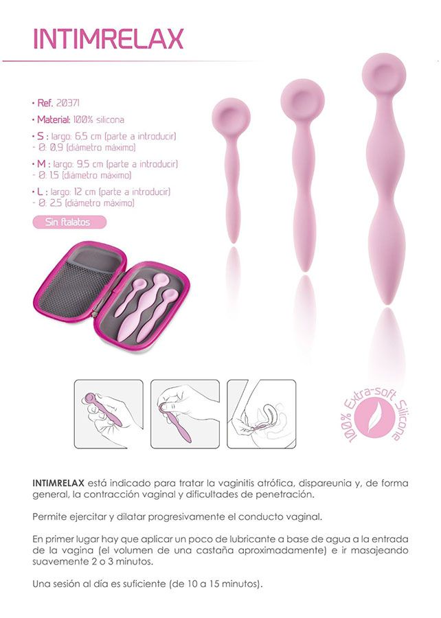 Система предназначена для лечения атрофического вагинита или вагинальной атрофии, сокращения канала влагалища, жжения и боли при проникновении во влагалище. Причиной таких неприятностей может быть инфекция (воспаление влагалища), атипичная морфология (чрезмерно узкий вагинальный канал), врожденные пороки развития или просто индивидуальное восприятие проникновения. Это расстройство часто сопровождается снижением уровня эстрогена, в результате чего происходит сужение канала влагалища, уменьшение выделяемой смазки и потеря эластичности стенок влагалища, слизистая влагалища становится тоньше и суше, нарушается баланс рН. Наиболее подвержены атрофическому вагиниту женщины в период после менопаузы – от 40% до 60% женщин страдают от урогенитальных симптомов в этот период жизни. Женщины детородного возраста менее подвержены этой проблеме – только 10% — 15% страдают вагинальной атрофией, особенно после родов или во время грудного вскармливания. Решением атрофического вагинита является система прогрессивной реабилитации Femintimate Intimrelax, которая позволяет постепенно расширять канал влагалища и избавиться от неприятных симптомов. Система состоит из трех элементов эргономической формы разных размеров для постепенного решения проблемы. Изготовлены элементы из нежного шелковистого 100% медицинского силикона – они полностью безопасны для организма. Система прогрессивной реабилитации Femintimate Intimrelax используется в рамках ежедневной программы упражнений, направленных на полное восстановление эластичности влагалища, уменьшения боли при половом акте, и, следовательно, избавлении от страха проникновения члена во влагалище. Система прогрессивной реабилитации атрофического вагинита Femintimate Intimrelax должна использоваться в сочетании со смазкой (лубрикатном) на водной основе. Использование смазки позволяет увлажнить в достаточной мере слизистую влагалища и нейтрализовать неприятные ощущения сухости при использовании системы. Нельзя использоваться вазелин или смазки на силиконовой основе – они повредят материал системы. Наслаждайтесь полной и здоровой половой жизнью! Рабочая длина малой вставки - 6,5 см., диаметр - 0,9 см. Рабочая длина средней вставки - 9,5 см., диаметр - 1,5 см. Рабочая длина большой вставки - 12 см., диаметр - 2,5 см.