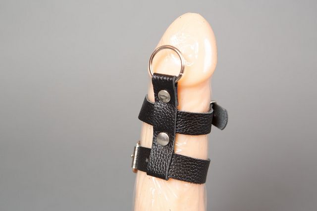 Сбруя на фаллос изготовлена из натуральной мягкой кожи. Два кольца (одно на пенис, одно — под мошонку), соединенные кожаной полоской. Кольцо позволяет позволяет использовать поводок или различные карабины. Сбруя застегивается на застежки-пряжки, размер универсальный.