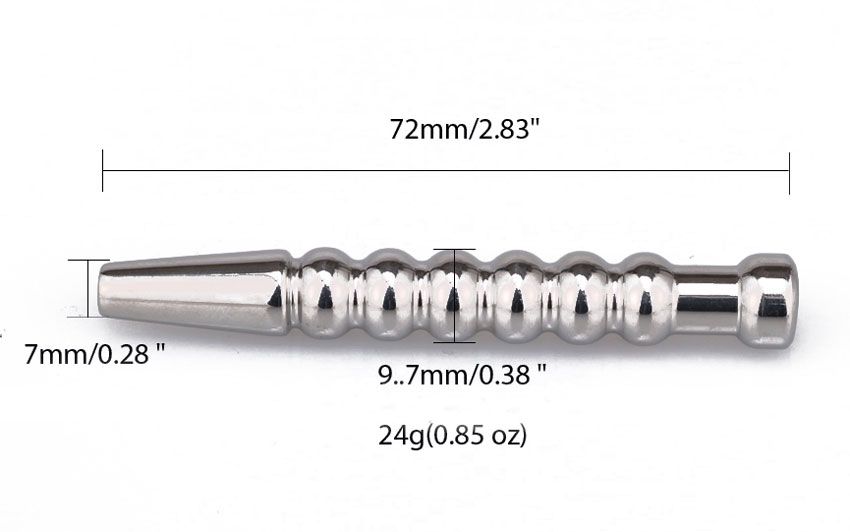 Уретральный катетер для стимуляции уретрального канала. Мужской катетер изготовлен из высококачественной медицинской стали, имеет рельефную структуру. Минимальный диаметр - 0,7 см. Вес - 24 грамма.