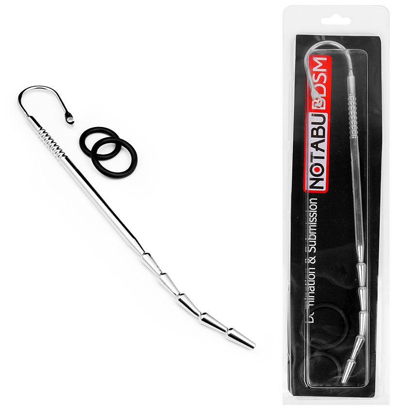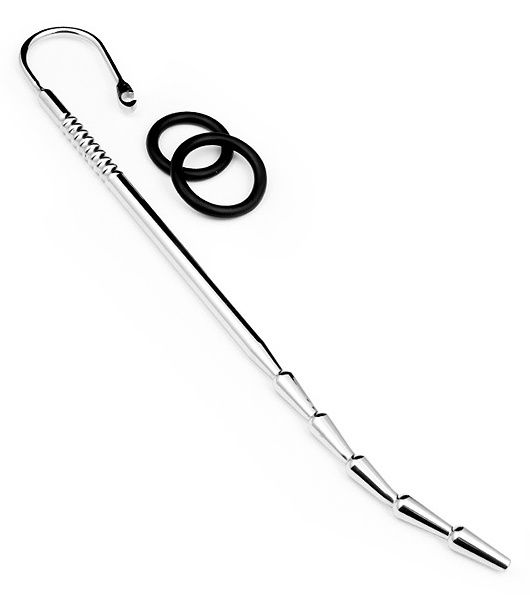Стимулятор уретры с изогнутым кончиком. Гладкий, без стыков и швов. Рабочая длина - 25 см. Диаметр колец - 2,5 и 3 см.