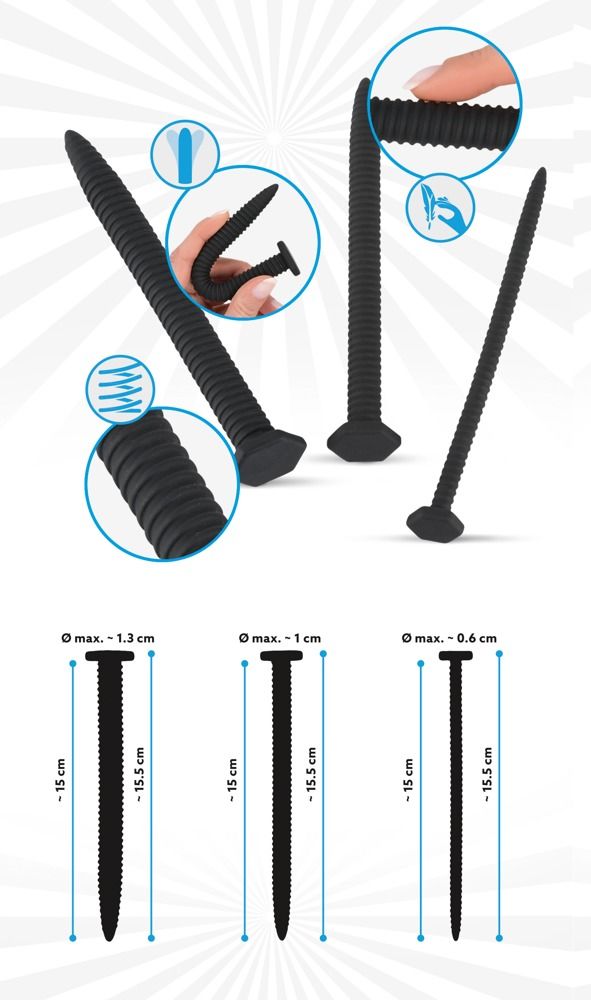 Набор из 3 винтовых уретральных плагов Screw Dilator. Диляторы одинаковы по длине и форме, отличаются диаметром. Хорошо гнутся. Диаметр плагов - 0,6, 1 и 1,3 см.