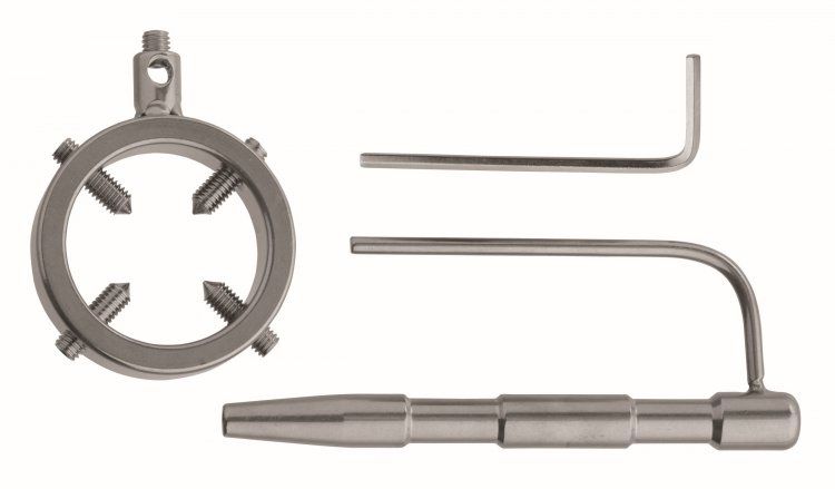 Мучительный инструмент для тех, кто давно вошел в мир жестоких наслаждений! Расширитель идеально подходит для использования соло, но также является отличным способом для Хозяина или Хозяйки наказать раба за любой проступок! Закрепи кольцо, вкрутив винты до уровня комфорта. Вставь расширитель и насладись яркими ощущениями! Расширитель полый, можно мочиться или эякулировать. Длина уретральной заглушки - 8,2 см. Внутренний диаметр кольца - 3,3 см.
