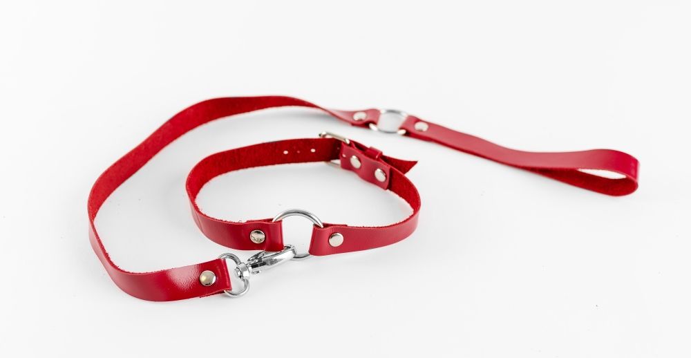 Яркий чокер с поводком, выполненный из натуральной кожи красного цвета. Изделие декорировано двумя металлическими кольцам. Удобно регулируемая длина. Нежная натуральная кожа очень комфортна в использовании. Обхват - 30-40 см. Длина поводка - 60 см.