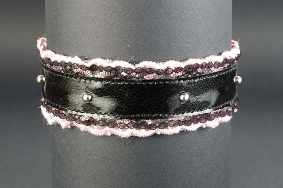 Подшитый кожа лак, кружева черные с розовым, застежка - кнопка, с 7 металлическими капельками.