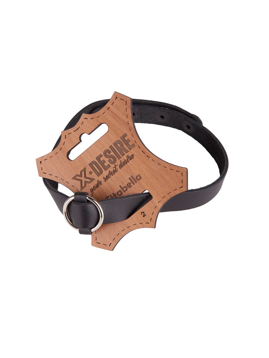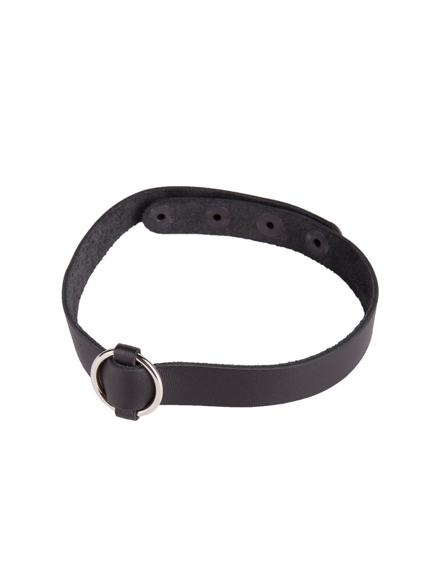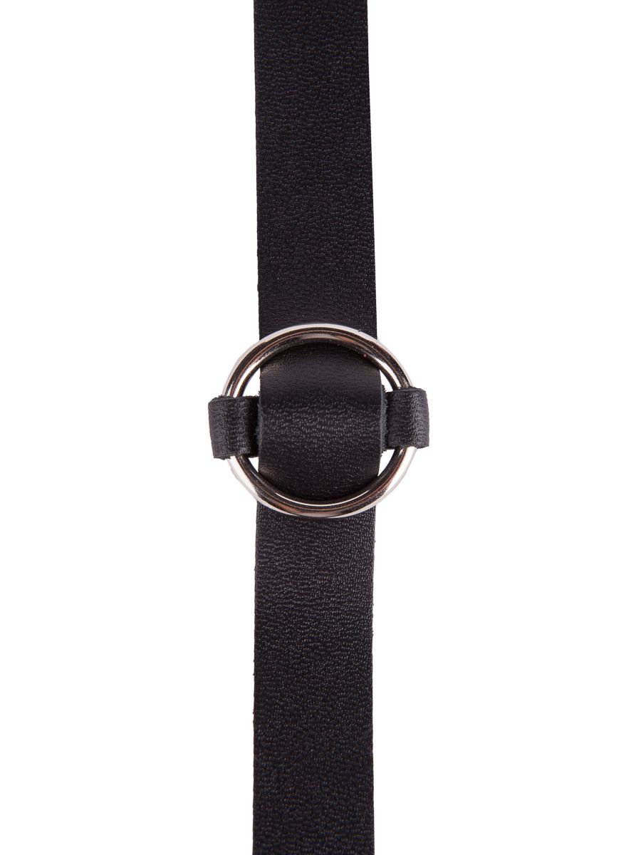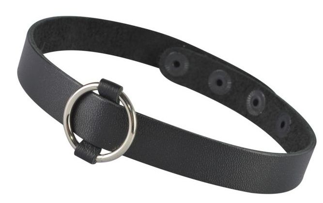 Чокер из натуральной кожи, декорирован металлическим кольцом. Регулируется при помощи кнопок. Металлическое кольцо имеет никелевое покрытие. Ширина - 1,5 см.