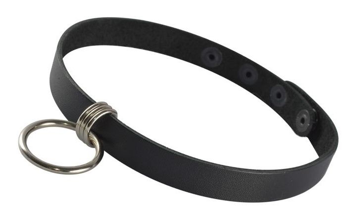 Чокер из натуральной кожи, декорирован подвесным металлическим кольцом. Регулируется при помощи кнопок. Металлическое кольцо имеет никелевое покрытие. Ширина - 1,5 см.