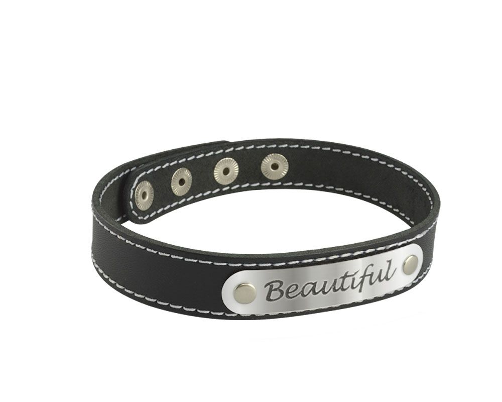 Чокер изготовлен из натуральной кожи и дополнен вставкой под металл с надписью Beautiful. Регулируется при помощи кнопок.
