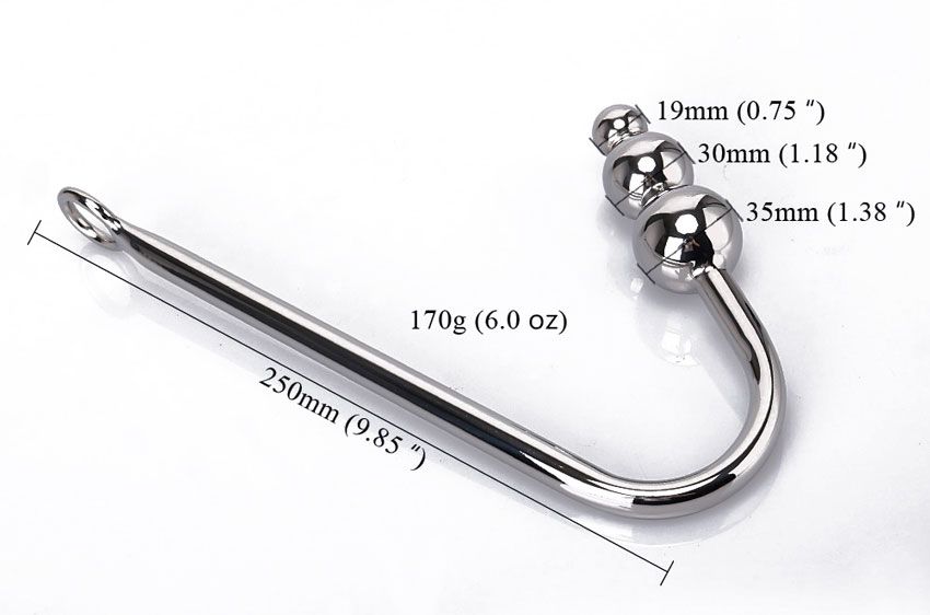 Легкий анальный крюк с тремя шариками на конце. Постепенно увеличивающиеся звенья облегчают ввод. Есть удобное кольцо для подвешивания. Масса - 170 грамм. Диаметр среднего шарика - 3 см., маленького - 1,9 см.