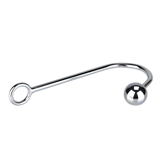 Анальный крюк из стали с круглым шаром на конце. Анальный крюк - девайс не для новичков, а для имеющих опыт в искусстве бандажа. При первом использовании анального крюка рекомендуется использовать наиболее простые техники связывания. С этим крюком можно использовать любые виды веревок - хлопковые или синтетические. Длина вводимой части - около 10 см. Диаметр шара - 3,6 см, остальная часть крюка составляет 22 см вместе с кольцом. Диаметр кольца для продевания веревки - 3 см.
