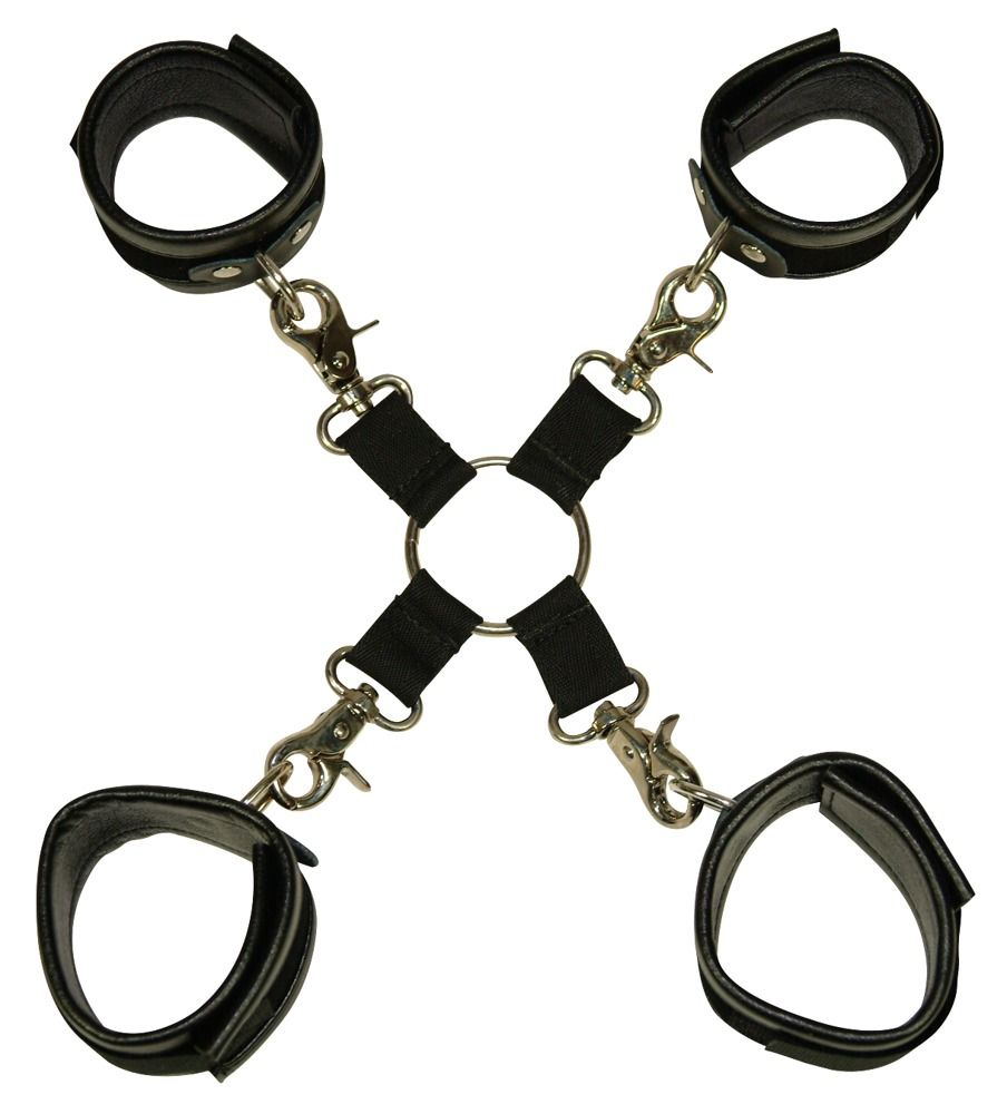 Чёрная бондажная фиксация: крестовина, наручники и оковы. Ширина браслетов - 5 см.