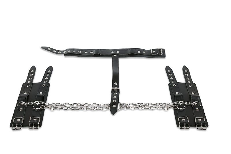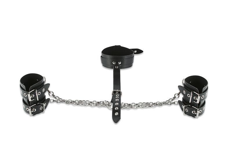 Хотите сковать свою Рабыню? Сегодня вы можете делать с ней всё, что угодно! А этот бондаж для фиксации поможет вам воплотить все свои прихоти в жизнь. Набор представлен ошейником и парой широких наручников, которые соединяются ремнём и цепями. Наручники съемные, они крепятся карабином. Длина удерживающего ремня и размер манжет регулируется по размеру. Вы может ограничить движения партнера, зафиксировав его руки как спереди, так и за спиной. А вместо рук заковать можно и ноги – делайте всё, что пожелаете! Длина манжет - 29 см., ширина - 10 см. Длина ошейника - 49 см., ширина - 5 см.