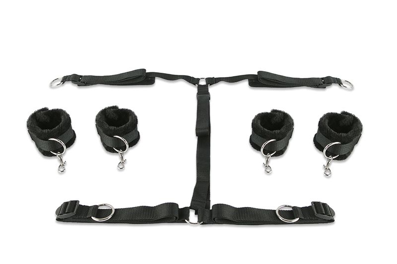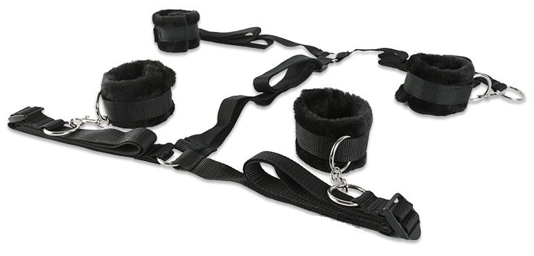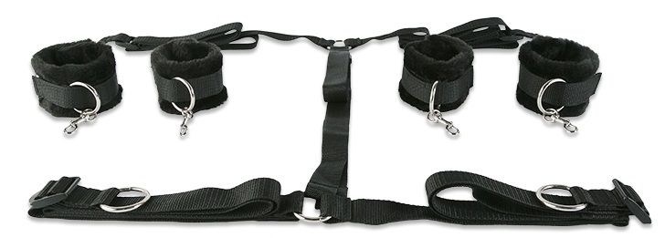 Зафиксируйте своего партнера, ограничив его движения. Привяжите его к кровати или просто свяжите – делайте всё, что позволительно в вашей ролевой игре! Набор фиксаторов включает 2 пары манжет, которые можно надевать на запястья и лодыжки, 2 пары карабинов и столько же ремней, позволяющих зафиксировать партнера на кровати или специальной распорке. Все элементы комплекта выполнены из кожзаменителя. Длина наручников - 39 см. Длина наножников - 42 см. Ширина манжет - 6 см.