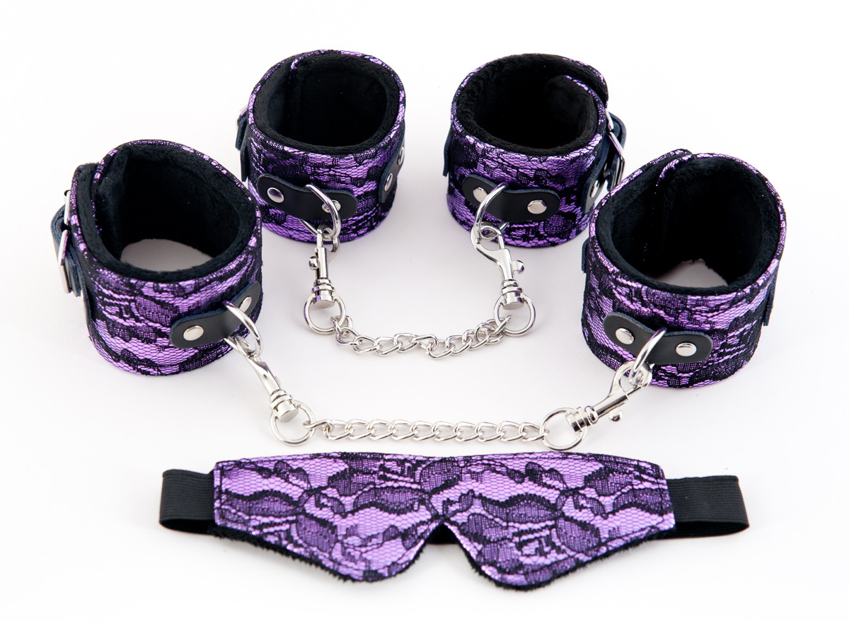 Набор: наручники, оковы и маска. Королевское сочетание пурпура и кружева только для любимой невольницы. Ты в полном подчинении у своего партнера. При такой игре вслепую чувства обострены и желания ярче.
