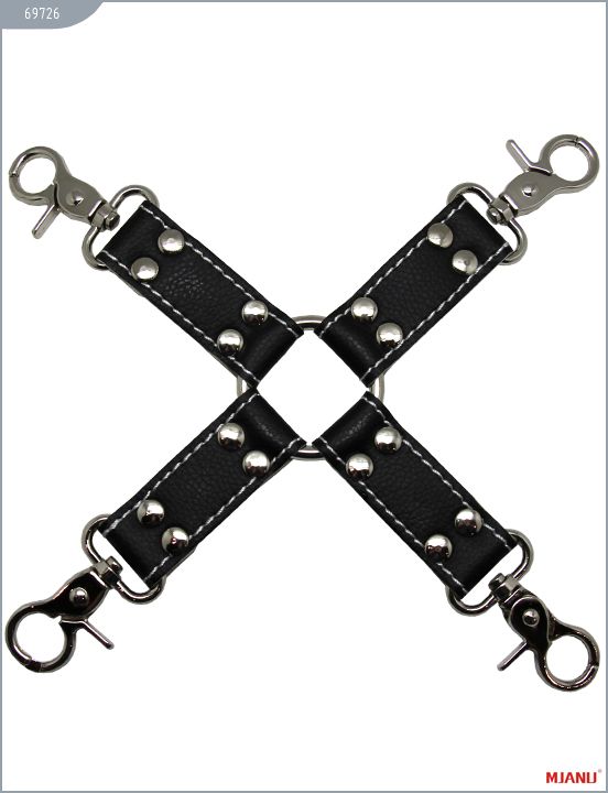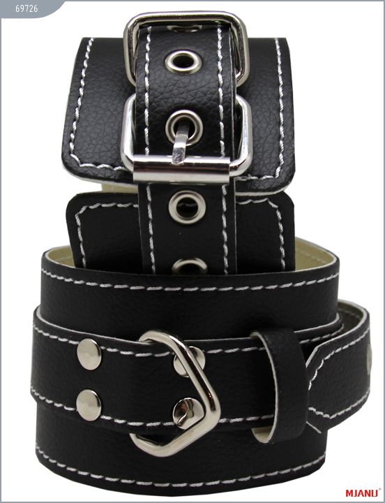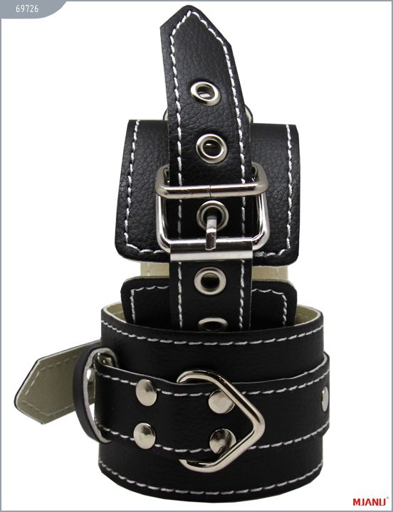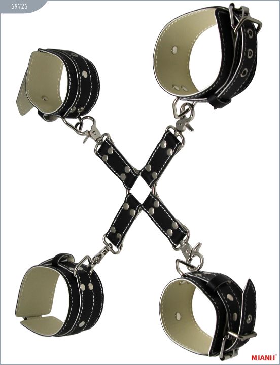Ассортимент Mjanu — высококачественные изделия с современной фурнитурой, аккуратными креплениями и отличной контрастной белой строчкой. Изготавливаются из натуральной кожи c PU покрытием, которая сохраняет свойство натуральной кожи пропускать воздух и устойчивость к деформации, но в отличии от натуральной кожи имеет более привлекательный внешний вид. Наручники и наножники соединяются между собой кольцом 4 с карабинами на концах. Все размеры — универсальные. Длина наручников с ремешком — 34 см., ширина — 5,5 см. Длина наножников с ремешком — 40,5 см., ширина — 6 см.