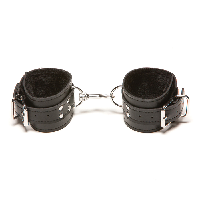 Широкие браслеты из искусственной, местами проклёпанной кожи и карабин… Именно такие наручники гарантируют плотный, но нежный захват. Виной тому меховая подкладка, препятствующая натиранию кожи. Теперь ничто не отвлечёт вас от роли беспомощной рабыни/раба!