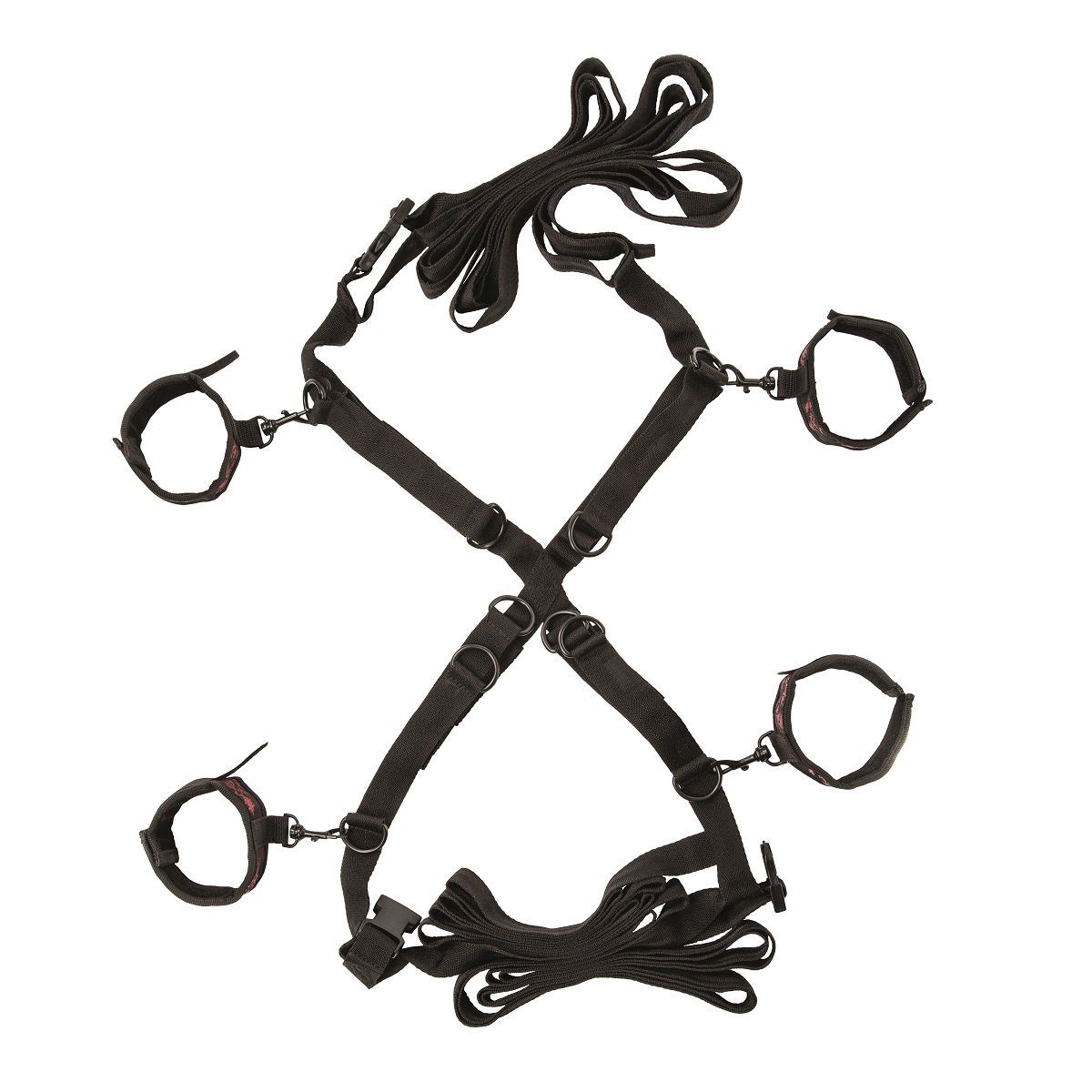 Фиксаторы и крепления на кровать Scandal Over The Bed Cross из чувственной премиум коллекции эротических аксессуаров Scandal. Воплощение фантазий в спальне. Манжеты и оковы на липучке с внутренней стороны отделаны приятным бархатистым материалом, исключающим нежелательный дискомфорт и раздражение кожи. С внешней стороны фиксаторы декорированы дизайнерским рисунком из блестящих красных нитей. Манжеты и оковы регулируются до 36,75 см. Прочные ремни регулируются до размера 456,25 см.
