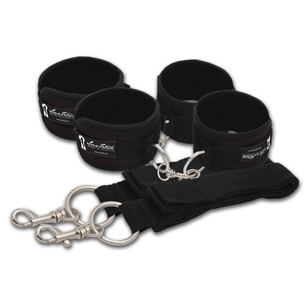 Самое лучшее от Lux Fetish для страстных любовников! Две пары комфортных наручников черного цвета. На каждом манжете металлическое кольцо, к которому пристегивается металлический карабин от строп, которые скрещиваются между собой под матрасом кровати! Раньше возникал вопрос: К чему пристегнуть наручники в кровати? Этот вопрос решил Lux Fetish специально для Вас! Стропы имеют регулирующуюся длину и подойдут для матраса любого размера! Размер: One Size.