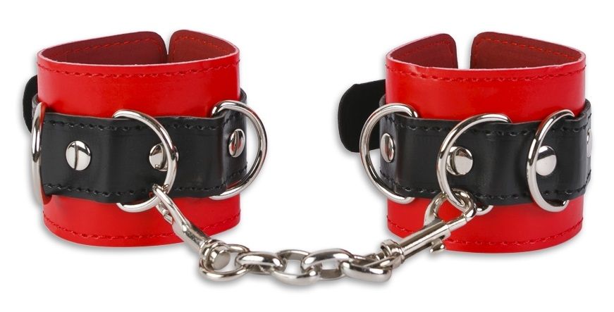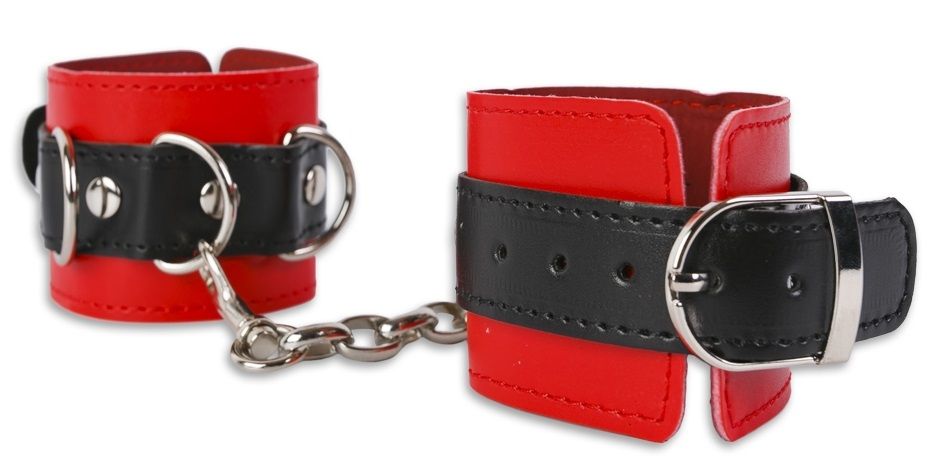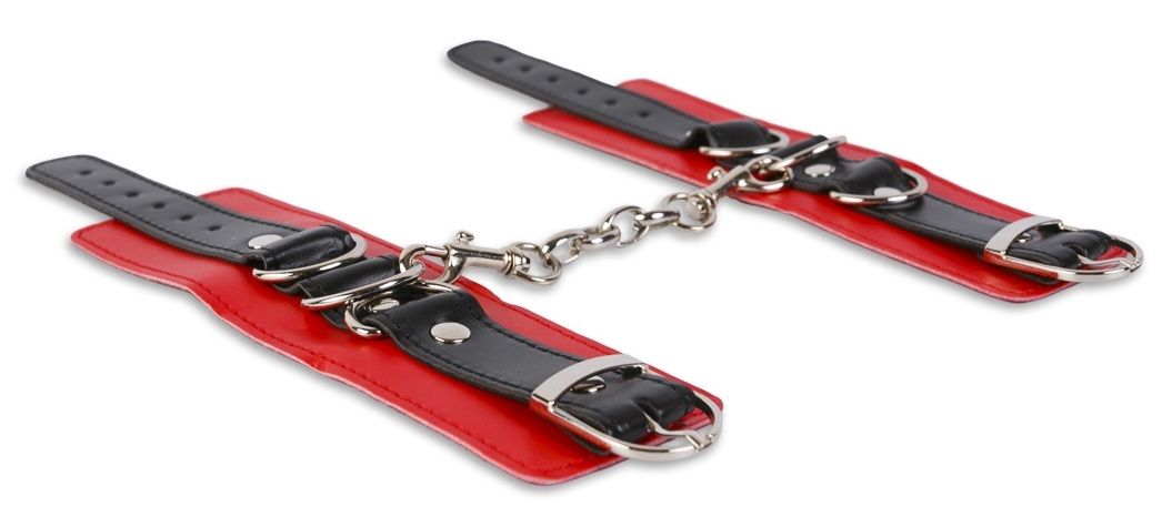 Атрибут для тех, кто любит ограничивать движения своего партнера. Покажите своё превосходство и позвольте себе приковать Сабмиссива. Фиксаторы выполнены из кожзаменителя красного и черного цвета. Манжеты украшены хромированными заклёпками и D-кольцами, и соединены между собой цепочкой. Цепочка превращает манжеты в наручники или фиксаторы для ног. При желании манжеты можно разъединить. Размер регулируется ремешком. Длина манжет - 25,5 см. Ширина - 5,5 см.