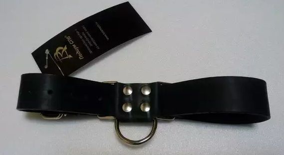 Ременная полоса из чёрной натуральной кожи с полукольцом в виде «восьмерки», с подвижной фиксацией. Легко затягивается на любое запястье. Застёгивается на пряжку. Ширина — 3 см.