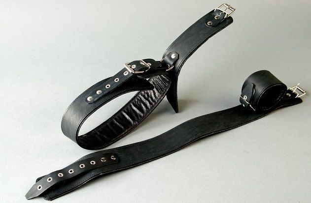 Данный бондажный комплект изготовлен из натуральной кожи с мягкой подкладкой (пена) для безопасного и комфортного использования.Состоит комплект из двух 8-образных частей,фиксирующих руки и бедра. Объём бёдра - от 45 до 59 см. Длина наручей - от 21 до 27 см.