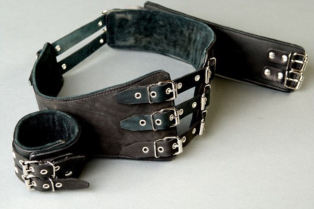 Данный бондажный комплект изготовлен из натуральной кожи черного цвета.Состоит комплект из жесткого пояса и наручей, фиксирующих руки. Регулировка размера пояса осуществляется ремнями спереди и сзади. Минимальный размер пояса - 74 см., максимальный - 100 см.