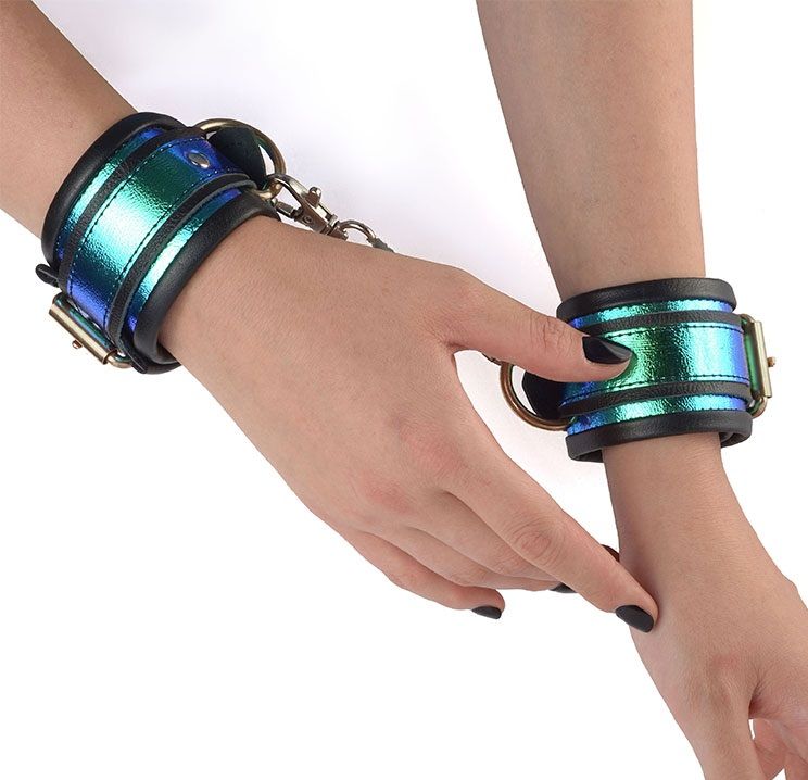 Наручники изготовлены из натуральной кожи черного цвета и представляет собой основу, поверх которой проходит ремешок, выполняющий как декоративную функцию, так и регулировочно-фиксирующую. Особенность изделию придает голографическая отделка «хамелеон», которая переливаясь голубым, синим, бирюзовым оттенками, отражает окружающие цвета. Для комфортного ношения край наручников обработан оторочкой, что делает их округлой формы. На ремешке располагается металлическая пряжка, при помощи которой можно подогнать изделие по размеру запястья. Соединить наручники можно при помощи карабинов, скреплённых при помощи небольшой кожаной перемычки. Вся используемая металлическая фурнитура имеет никелевое покрытие. Ширина - 5,5 см.