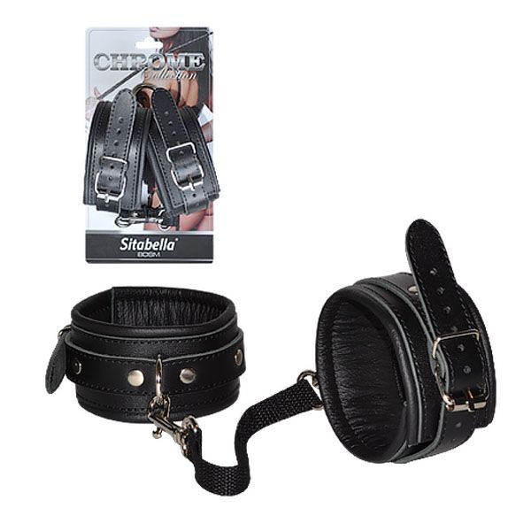 Строгие, крепкие, надежные. Черные наручники выполненные из натуральной кожи с хромированными деталями незаменимый атрибут в страстных играх. Соединяются между собой ремешком с двумя карабинами на концах и надежно фиксируются на запястьях с помощью двух ремешков.