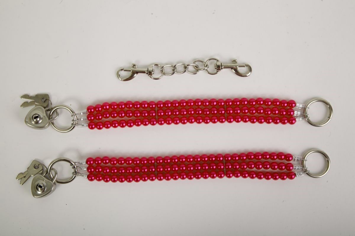 Красивые наножники из красного жемчуга с замочками в виде сердца и четырьмя ключиками. Чтобы ограничивать движения есть небольшая цепочка с двумя карабинами. Упаковка - картонная золотая коробка с бантиком. Длина соединительной цепочки - 13 см. Длина браслетов - 26 см., ширина - 2,5 см.
