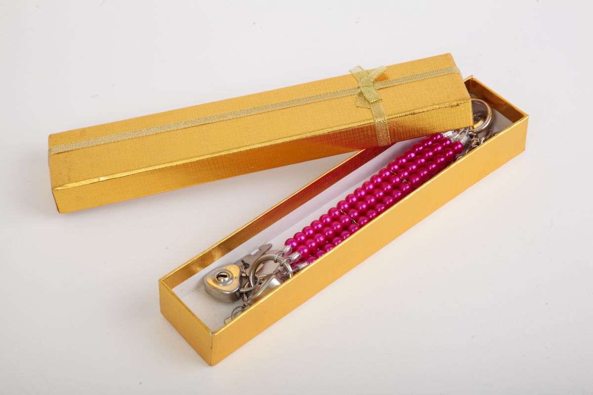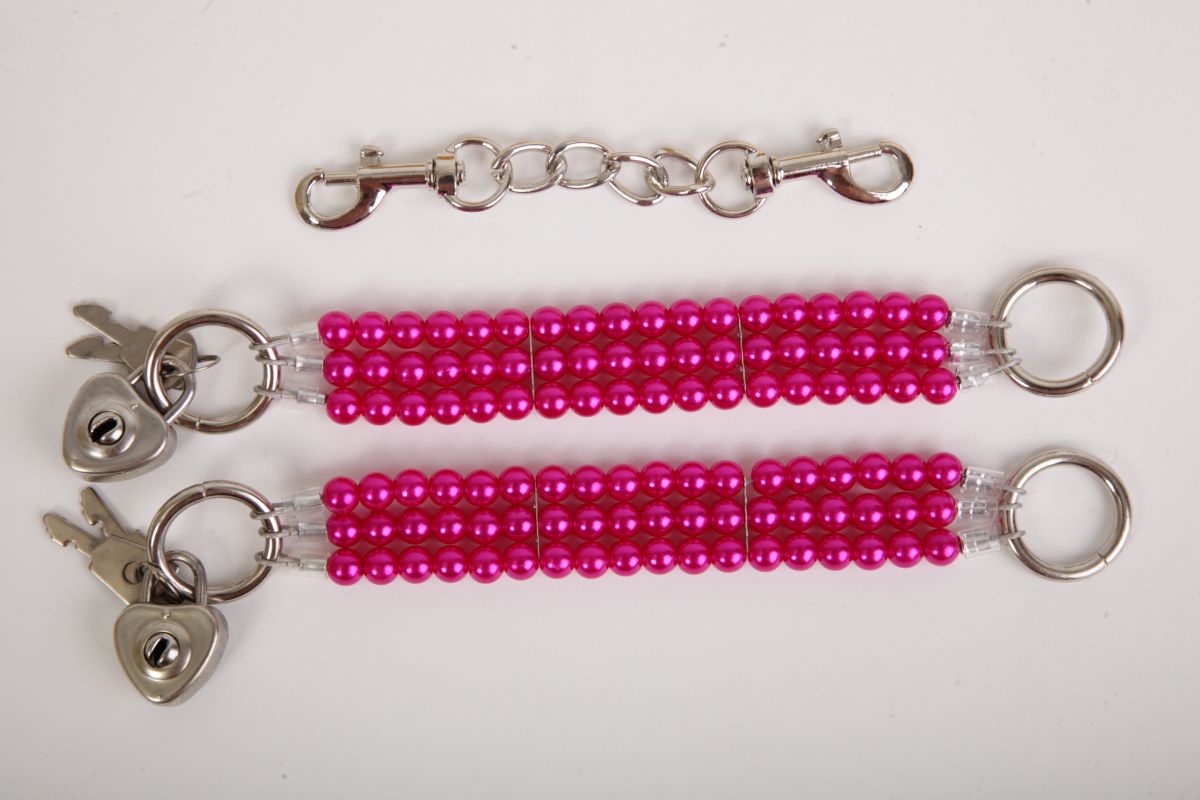 Ярко-розовые наручники с тремя нитями из жемчуга . Закрываются на замочки в виде сердечек с индивидуальными ключиками. Наручники можно соединить небольшой цепочкой с карабинами. Упаковка - золотая подарочная коробка с бантом. Длина соединительной цепочки - 13 см. Длина наручников - 20 см., ширина - 2,5 см.