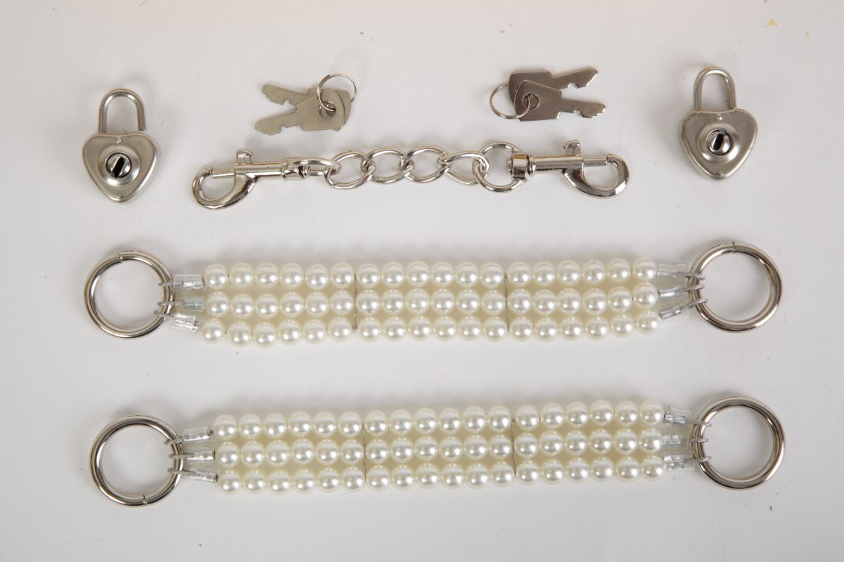 Белые наручники с тремя нитями из жемчуга . Закрываются на замочки в виде сердечек с индивидуальными ключиками. Наручники можно соединить небольшой цепочкой с карабинами. Упаковка - золотая подарочная коробка с бантом. Длина соединительной цепочки - 13 см. Длина наручников - 20 см., ширина - 2,5 см.