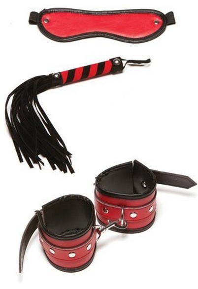 Чтобы начать знакомство с волнующим миром БДСМ, нужно так мало – желание, разделяющий ваши интересы партнёр и этот двухцветный набор из трёх предметов. Плотная маска погрузит пассива в полную темноту, наручники с ремешками ограничат его подвижность. Маленькая же многохвостая плеть подарит и дразнящие, и кусающие прикосновения.