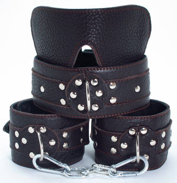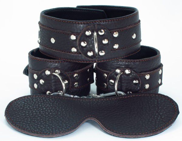 Набор БДСМ-аксессуаров из мягкой кожи черного цвета. В комплекте: маска на глаза, ошейник, манжеты-наручники.