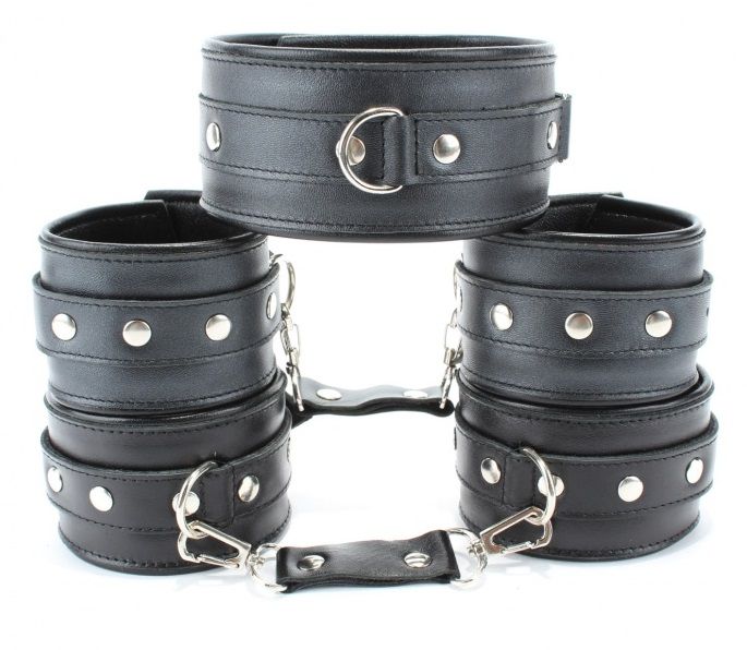 Набор аксессуаров, изготовленных из натуральной кожи. В него входят: наручники и оковы, украшенные заклепками, которые можно соединять и комбинировать между собой при помощи прочных перемычек с карабинами (входят в комплект). Размер меняется при помощи застежки. Также имеется ошейник с одним кольцом. Размер регулируется застежками. Модный интимный аксессуар не сдавливает и не нарушает кровообращение, так как изготовлен из мягкой кожи. Ширина оков - 5,7 см. Длина перемычек - 6 см. Ширина ошейника - 5,7 см.