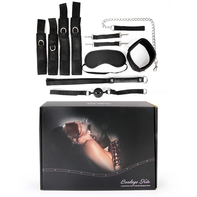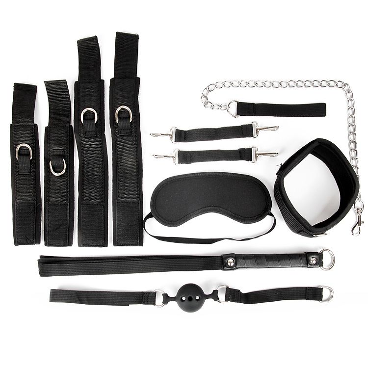 Великолепный набор аксессуаров для любителей БДСМ. В комплект входят наручники, оковы, ошейник с цепочкой-поводком, плеть, кляп, маска. Кляп, наручники, оковы, ошейник и маска снабжены специальной внутренней накладкой, предотвращающей натирание кожи. Также изделия имеют возможность регулирования размера. Плеть-флоггер состоит из хвостов и удобной рукоятки длиной, снабжённой петлёй для подвешивания на крючок. Кляп оснащён шариком с отверстиями для дыхания. Наборы упакованы в большие коробки. Длина хвоста флоггера - 30 см., рукояти - 15 см.