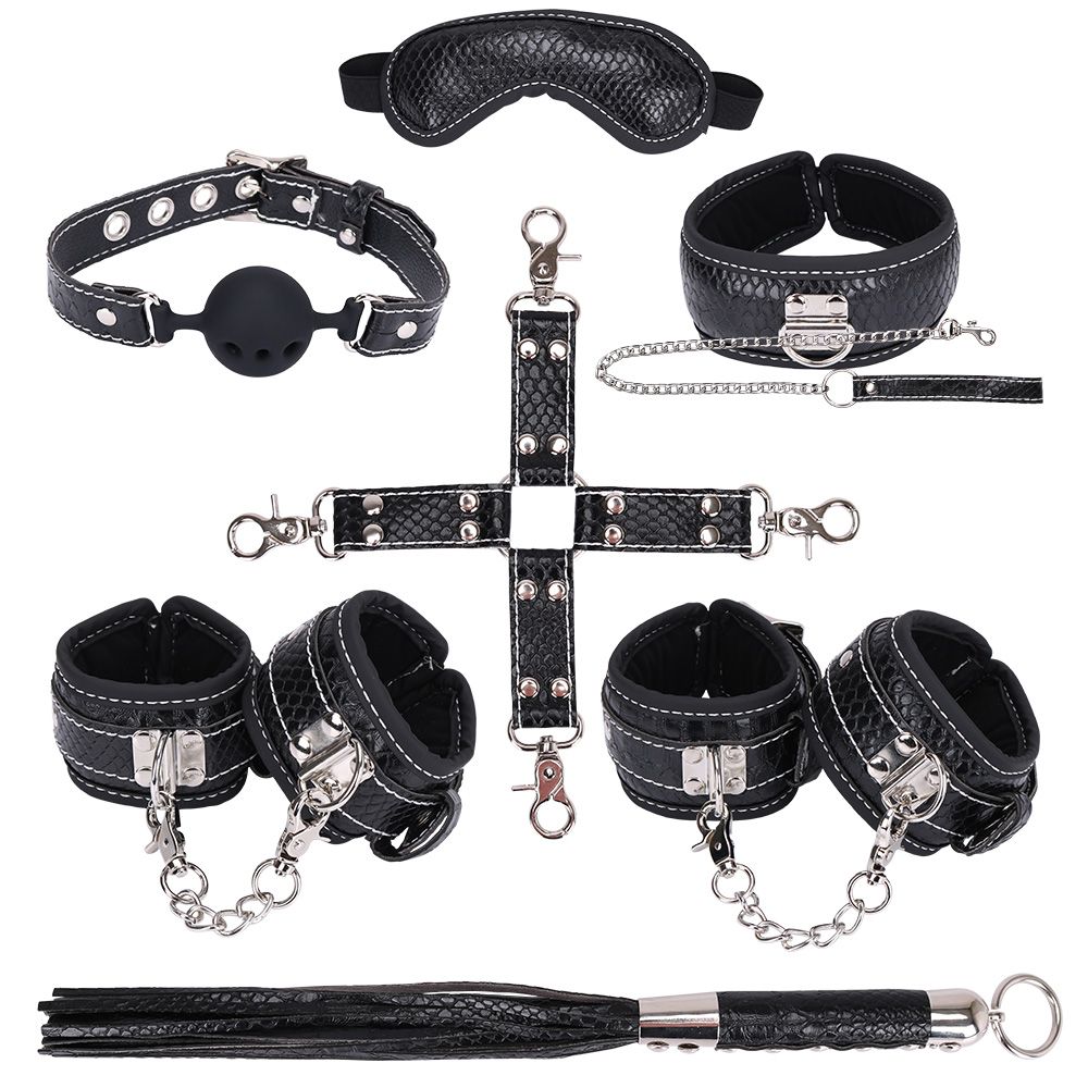 Великолепный набор аксессуаров для любителей БДСМ. В комплект входят наручники, оковы, ошейник с цепочкой-поводком, фиксатор, плетка, кляп, маска. Кляп, наручники, оковы, ошейник и маска снабжены специальной внутренней накладкой, предотвращающей натирание кожи. Также изделия имеют возможность регулирования размера. Плеть-флоггер состоит из хвостов и удобной рукоятки с металлическими вставками и кольцом для подвешивания на крючок. Кляп оснащен шариком с отверстиями для дыхания. БДСМ аксессуары выполнены в черном цвете и отделаны под кожу рептилии.