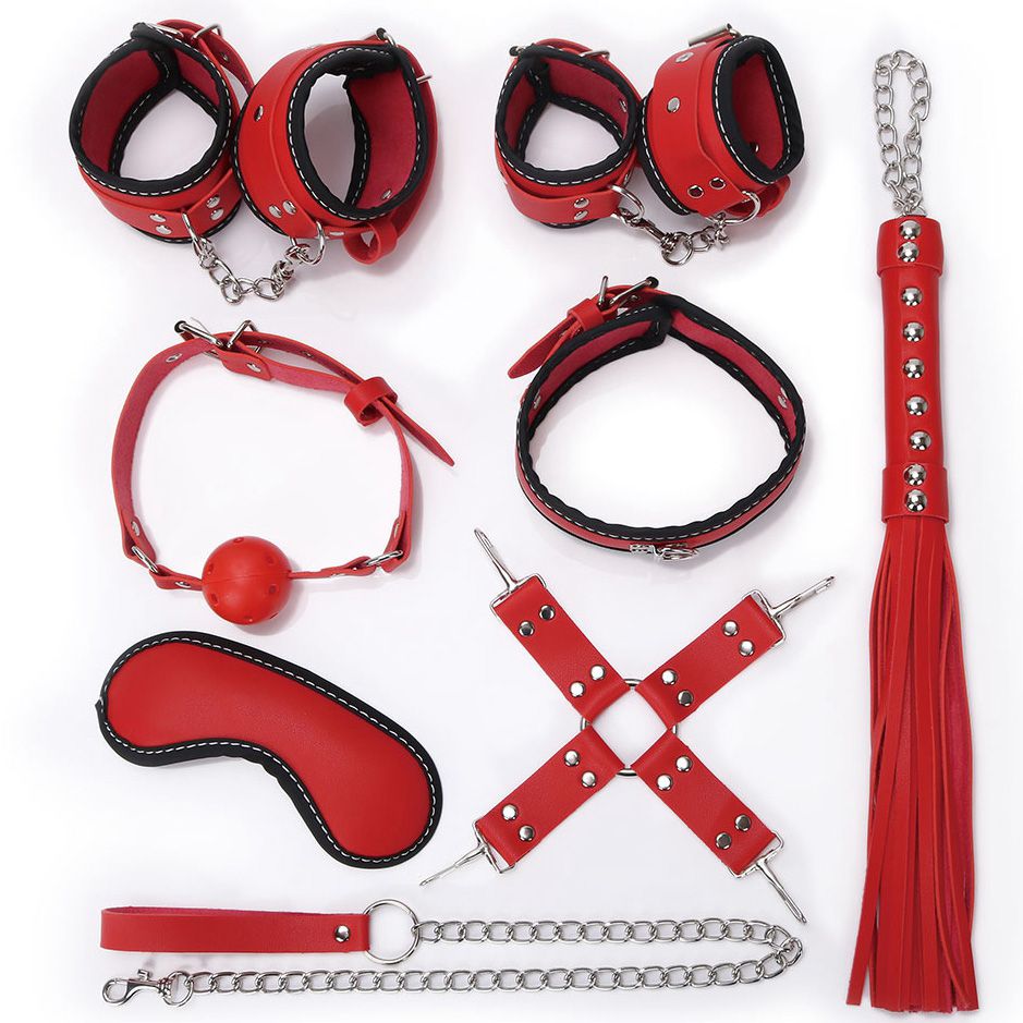 Пикантный красно-черный набор БДСМ: маска, ошейник, кляп, фиксатор, наручники, оковы, плеть Bior toys NTU-80451
