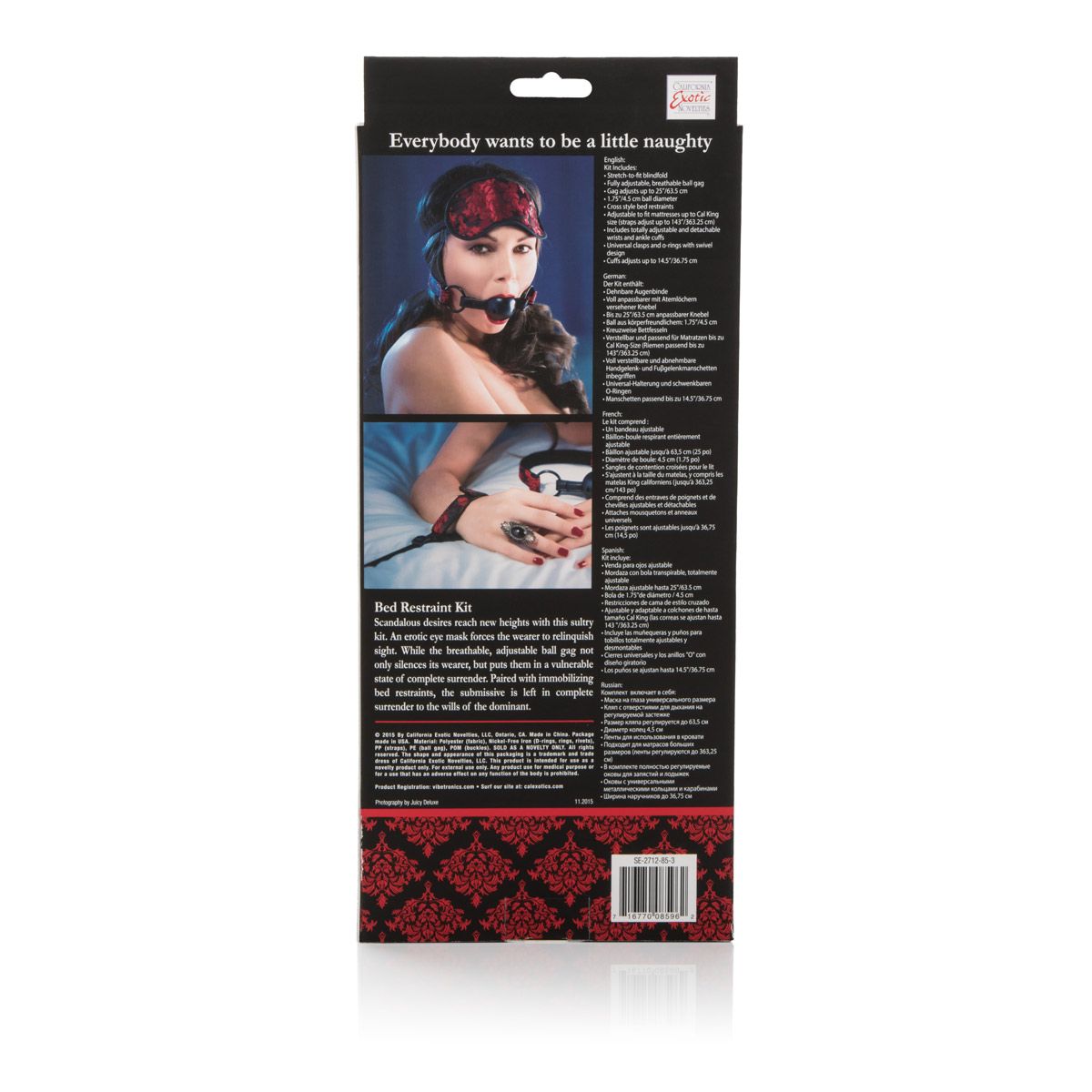 Набор для интимных удовольствий Bed Restraint Kit из чувственной премиум-коллекции эротических аксессуаров Scandal. Отделанные приятным бархатистым материалом с внутренней стороны, оковы на запястья и лодыжки исключают дискомфорт и раздражение кожи. Также с внешней стороны оковы декорированы дизайнерским рисунком из блестящих красных нитей. Комплект отлично подойдет для кровати любого размера. Оковы могут быть использованы как с ремнями, так и отдельно. В комплекте: 4 регулируемых ремня для привязывания к кровати с металлическими кольцами и карабинами, ремень для полной фиксации всей конструкции с обратной стороны кровати или матраса, маска, кляп. Длина каждого ремня - 144 см. Общая длина ремней - 363,2 см. Длина манжеты (можно использовать отдельно) - 36,75 см.