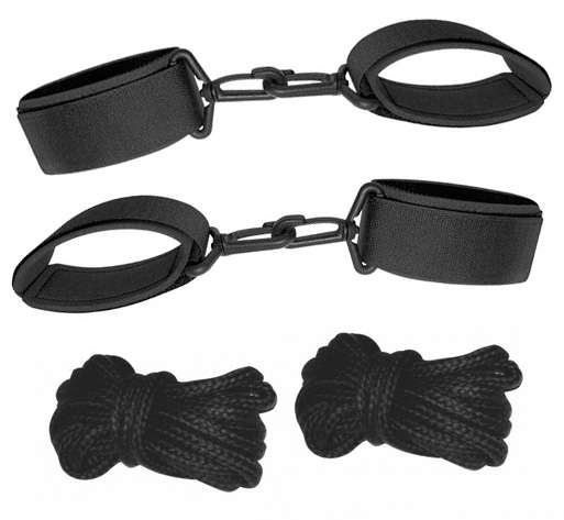 В набор входит две пары наручников (фиксация для рук и ног) и две веревки. Длина веревок - 1 метр каждая.
