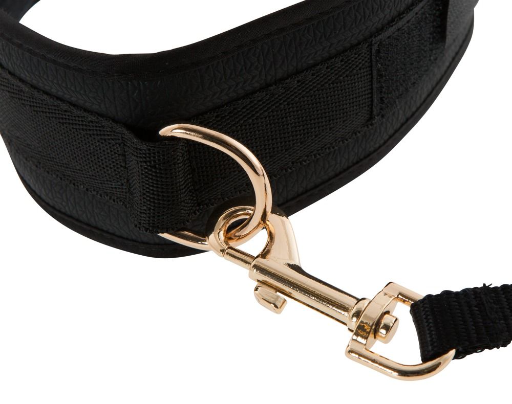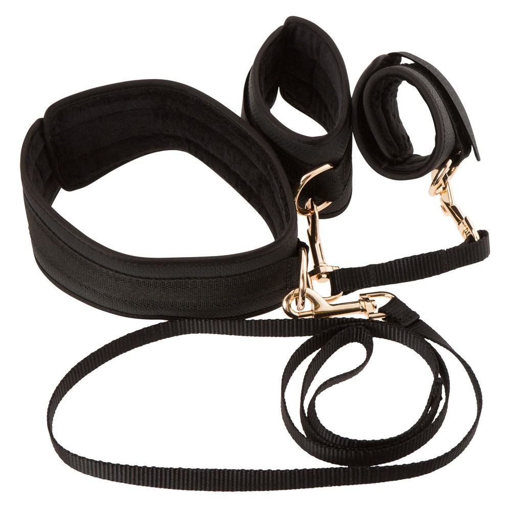 Набор для бондажа Bondage Set: ошейник с поводком и наручники. Ширина ошейника - 5 см., максимальных обхват - 44 см. Длина поводка - 106 см. Ширина манжет - 7 см., максимальный обхват - 24 см.