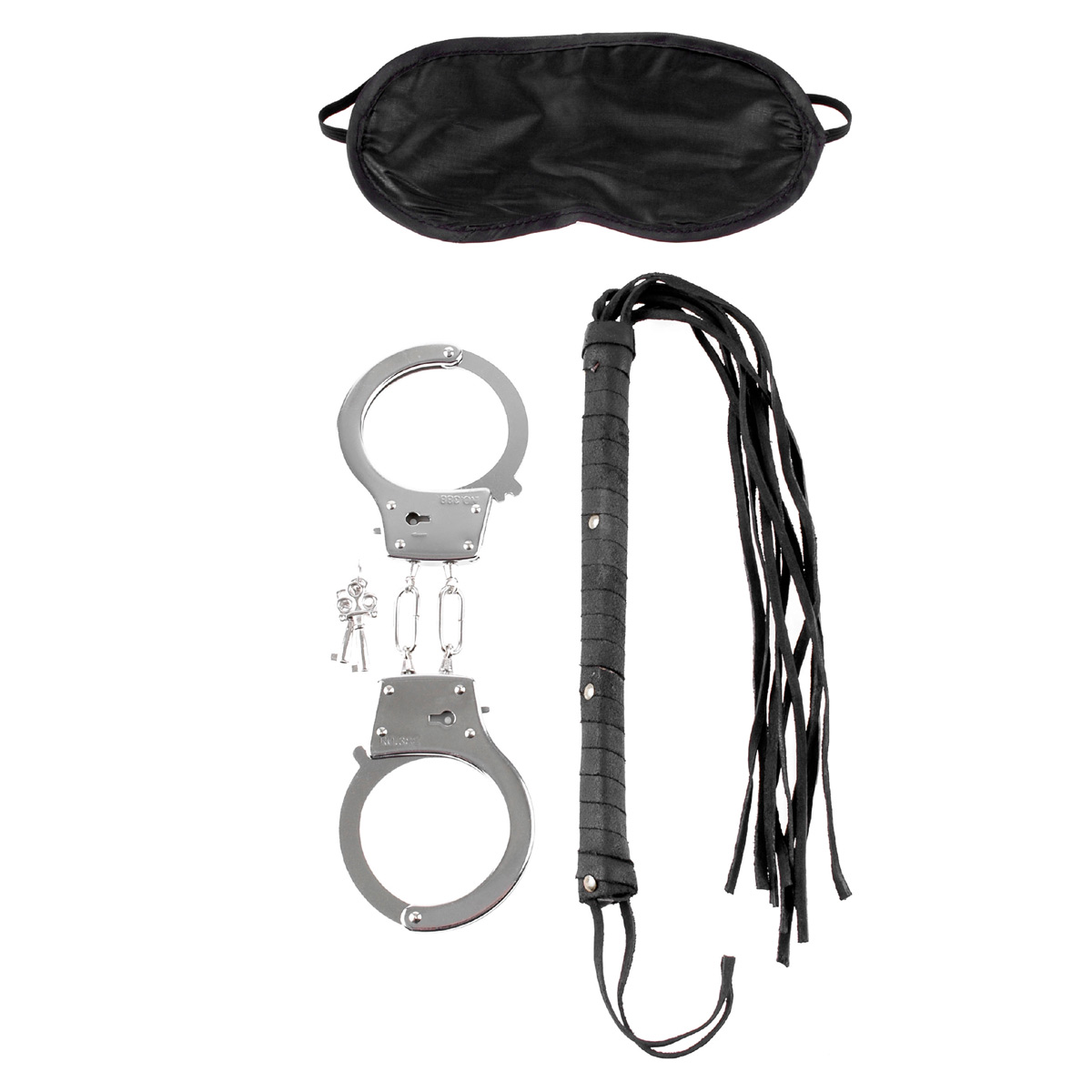 В этом наборе есть всё необходимое, чтобы в сексе зайти чуть дальше обычного. Мягкая непроницаемая маска на резинке плотно обхватит голову, не давая увидеть действия партнёра – можно только почувствовать! Наручники с ключиками не дадут свободы рукам. Чёрная многохвостая кожаная плеть подарит чувственное скольжение кончиков по коже или звонкие удары – до алых полос! В комплекте: тканевая маска на глаза, кожаная плеть, металлические наручники с ключиками. Длина плети - 50 см.