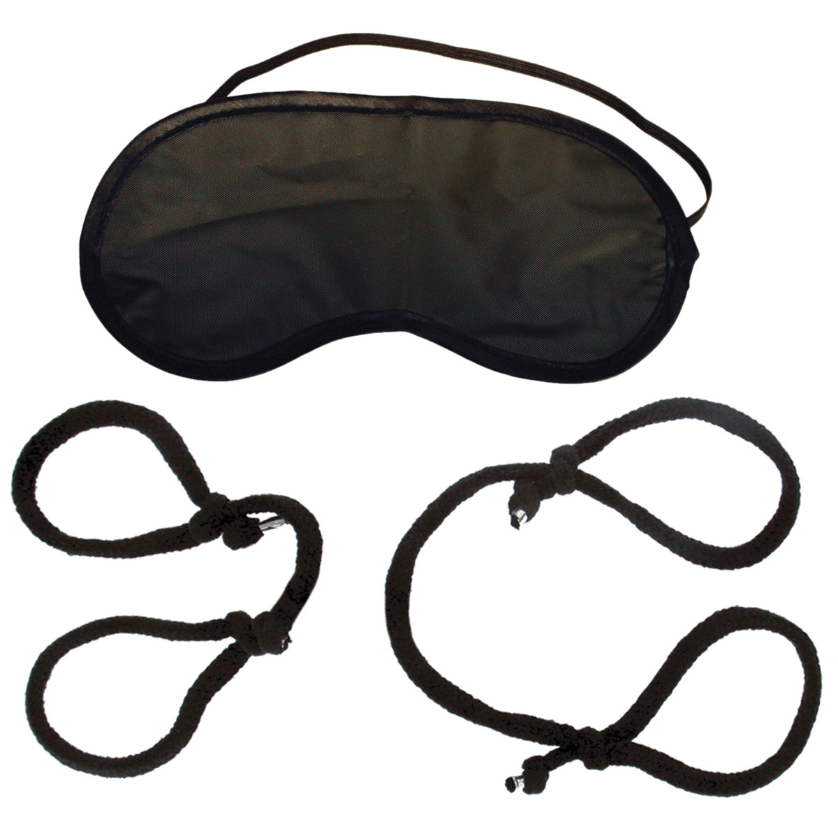 Набор для эротических игр чёрного цвета. Наручники и наножники в виде веревки, которые регулируются с помощью утягивания. Маска на глаза на резинке.