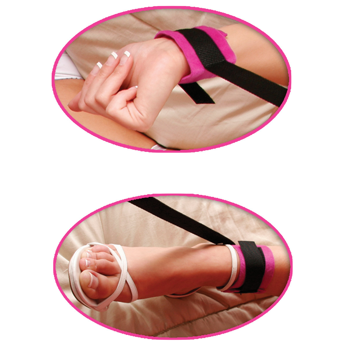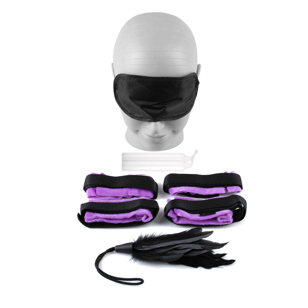 Набор для эротических игр, состоящий из плюшевых розовых оков на руки и ноги, с веревками для привязывания, размер регулируется при помощи застежек-липучек. В комплект так же входят: черное перышко, маска на глаза черного цвета и две свечи. Длина пёрышка - 16 см.