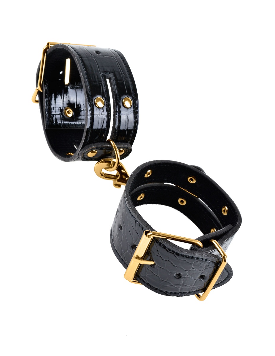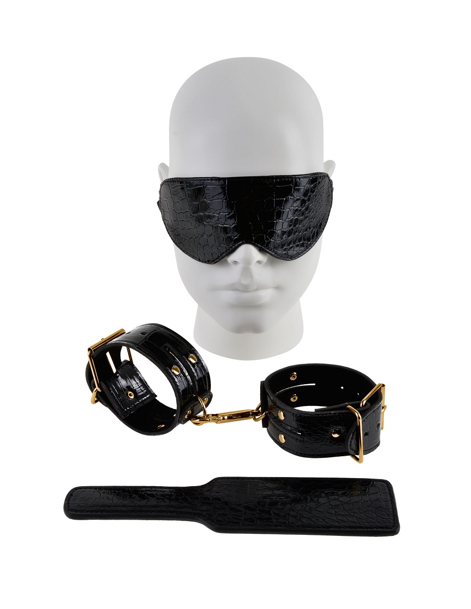 Этот изысканный комплект имеет все, что нужно для воплощения фантазий в жизнь!Маска имеет мягкую плюшевую подкладку, что комфортно ощущается на коже, эластичный ремешок тянется, чтобы соответствовать большинству размеров.Придумайте за что наказать партнёра и сделайте это глянцевой, чёрной шлёпалкой из кожи под крокодила, а второй стороной более гладкой можете поласкать возлюбленного между шлепками. Поймайте в плен любви вашего партнёра наручниками, которые идеально подходят для фиксации запястья или лодыжек. Элегантные запонки, мягкая плюшевая подкладка и регулируемый ремень с пряжкой, что подходит для большинства размеров. Манжеты соединяются между собой золотым карабином и обеспечивают полное смирение и повиновение .