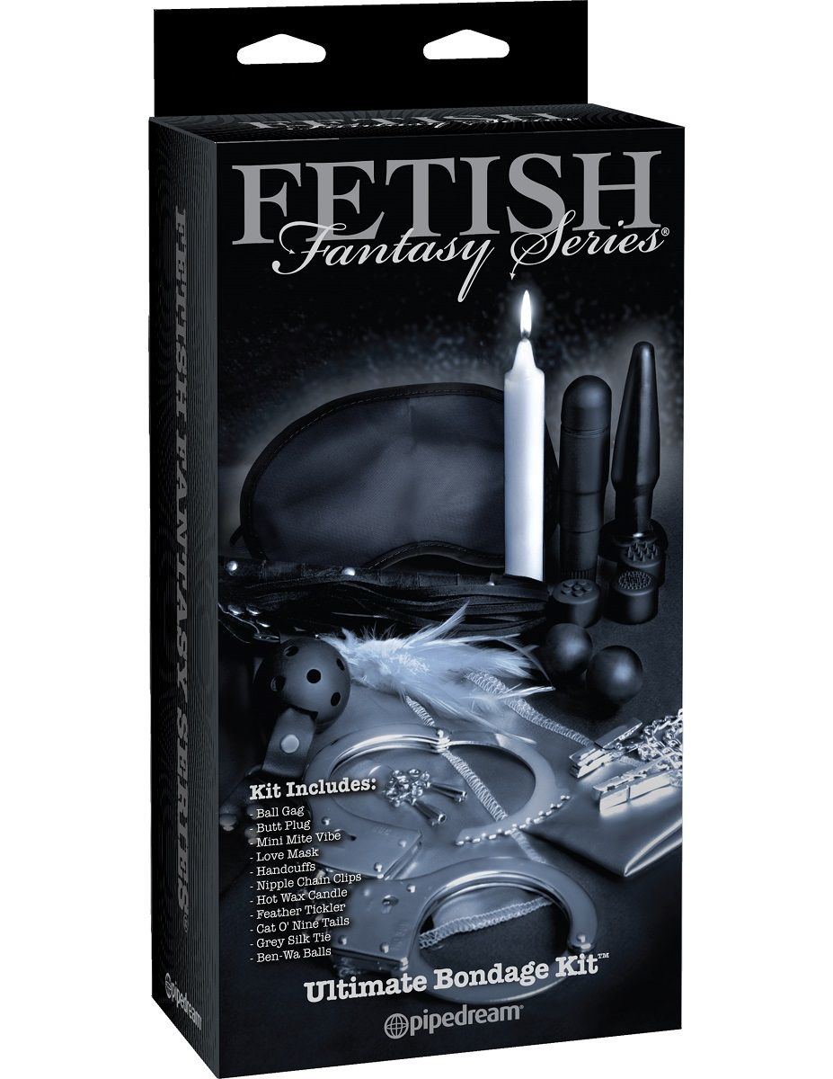 Набор для любовных и БДСМ игр Ultimate Bondage Kit. В него входят: вибромассажёр со сменными насадками, анальная пробка, вагинальные шарики, кляп, наручники, маска, клипсы для сосков, стек с пером, плетка, ленты для связывания, свеча. Порадуйте вашего партнера, попробовав каждый предмет из этого чудесного и очень стильного набора. Свяжите партнера шарфиком или закуйте наручниками и, воспользовавшись пуховкой или плёткой, разогрейте тело и эмоции партнера. Наденьте на себя маску, которая придаст вам таинственности. Зафиксируйте на сосках зажимы, чтобы распалить страсть, и позвольте любимому ввести в вас вагинальные шарики или анальную пробку. Пара ласк, и в ход пойдут кляп, свеча и вибратор со всеми насадками. В комплекте: вибромассажёр со сменными насадками, анальная пробка, вагинальные шарики, кляп, наручники, маска, клипсы для сосков, стек с пером, плетка, ленты для связывания, свеча. Батарейки не входят в комплект. Материалы - нейлон, воск, анодированный пластик, полиэстер, спандекс. Диаметр вагинальных шариков - 3,3 см. Диаметр кляпа-шара - 4,3 см. Длина анальной втулки - 11,5 см., диаметр - 2,1 см.